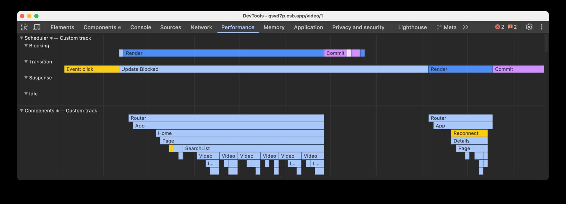 We’re working on a new set of custom tracks to performance profilers using browser APIs that allow adding custom tracks to provide more information about the performance of your React app.